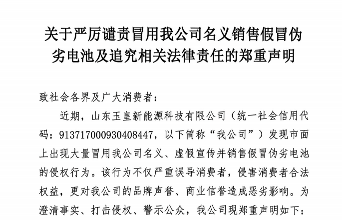 关于严厉谴责冒用我公司名义销售假冒伪劣电池及追究相关法律责任的郑重声明