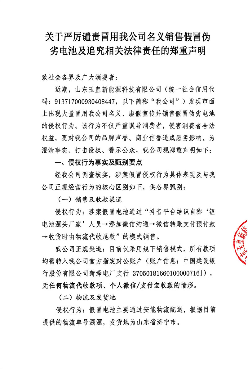 关于严厉谴责冒用我公司名义销售假冒伪劣电池及追究相关法律责任的郑重声明