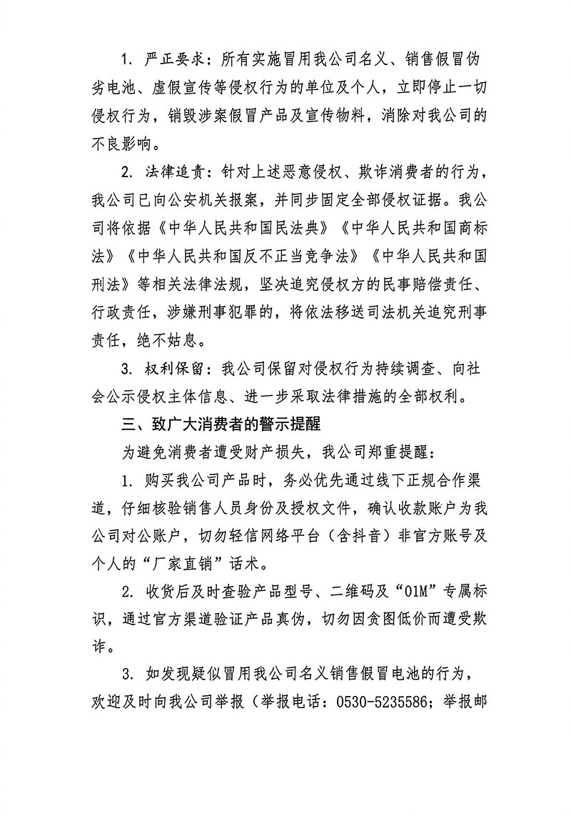 关于严厉谴责冒用我公司名义销售假冒伪劣电池及追究相关法律责任的郑重声明